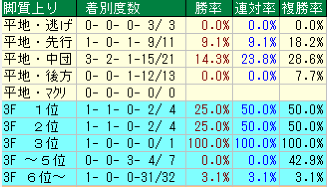 ・前走4角9番手以内(0・0・0・22)複勝率0%