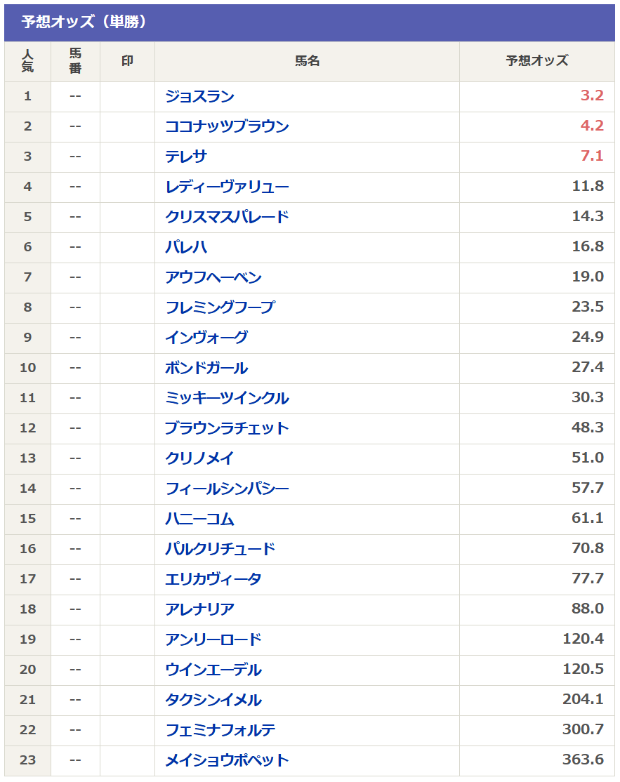 現時点の予想オッズを見ると5・6番人気のクリスマスパレードとパレハの人気が逆転する可能性もあるので、予想オッズ6番人気以内馬を上位人気馬として扱います。