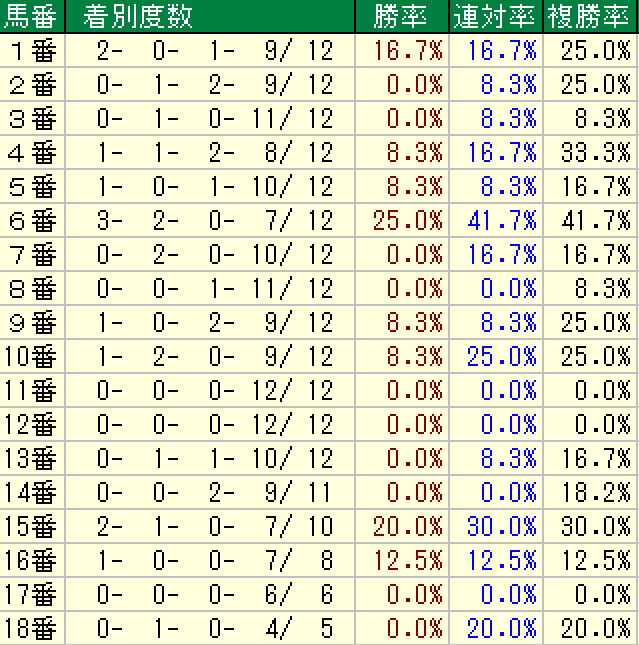 外枠なら14番ゲート以降が良く、昨年は8枠16番の10番人気ワイドラトゥールが好走した。