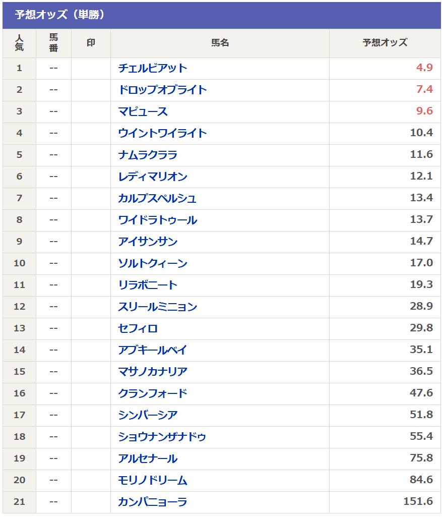 現時点の予想オッズを見ると大混戦ですが、チェルビアット・ドロップオブライト・マピュース・ウイントワイライトは上位人気入ってきそう。