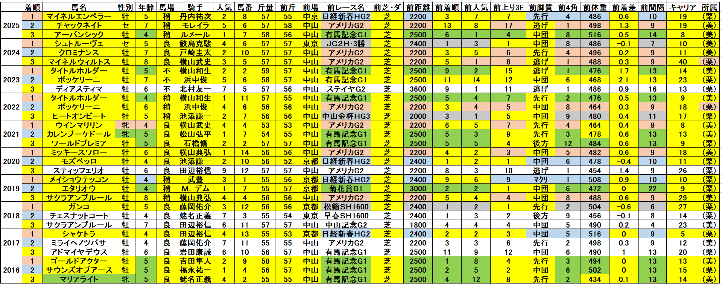 黄色部分は5番人気以内馬で、赤・青・緑・灰色部分は強調部分として色分けしています。