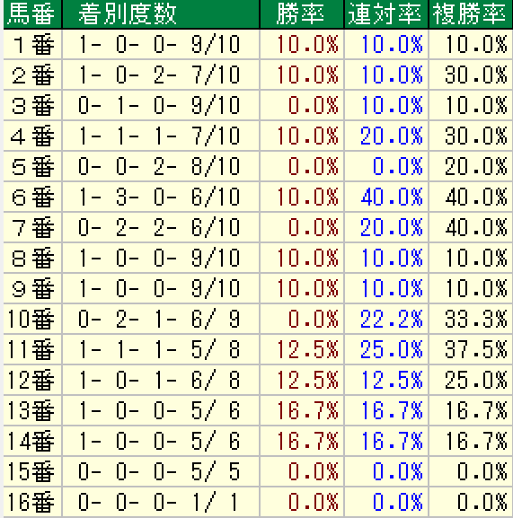 これを見ると勝ち馬はいるものの13番ゲート以降から複勝率が落ちています。