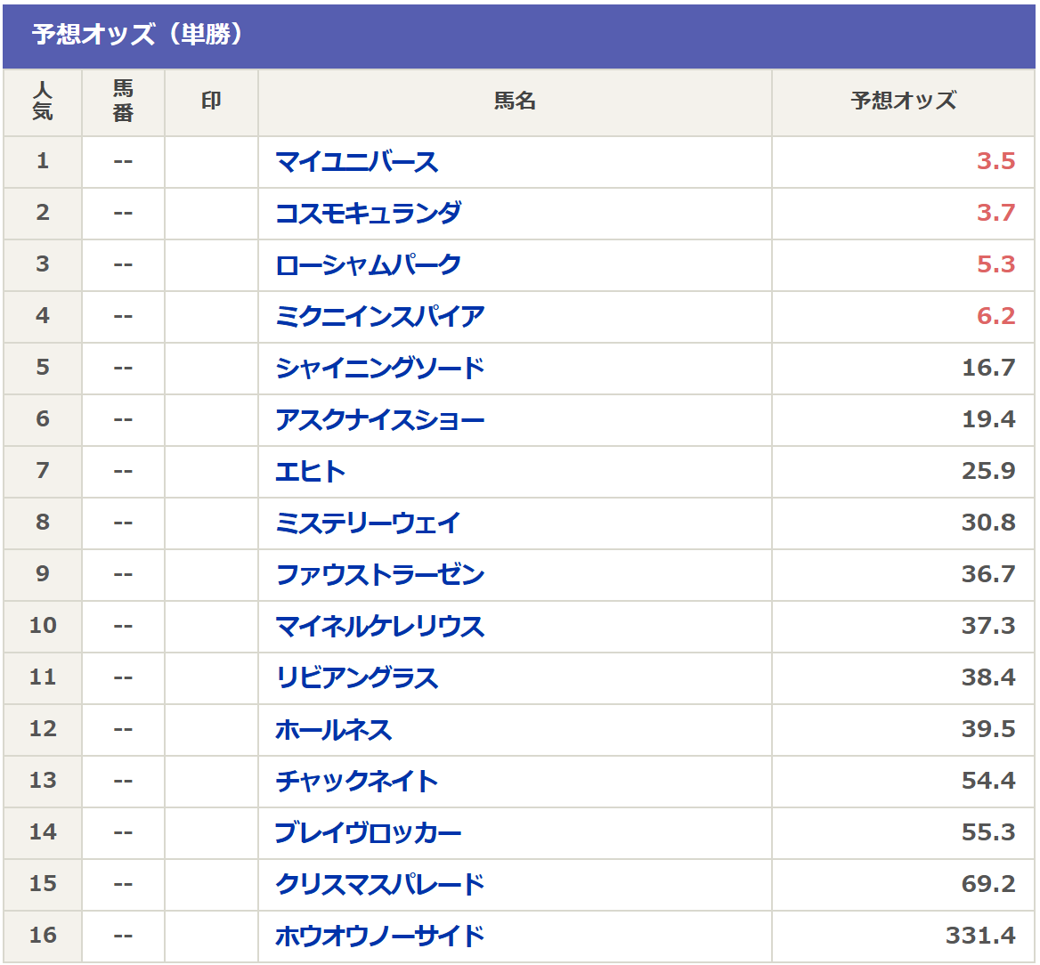 現時点の予想オッズを見ると4強構成となっているので、予想オッズ4番人気以内馬を上位人気馬として扱います。