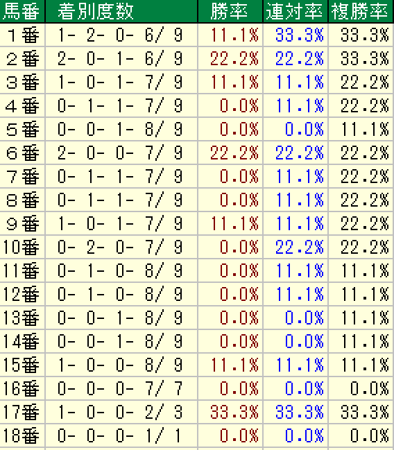 これを見ると複勝率では10番ゲート以内が良さそう。