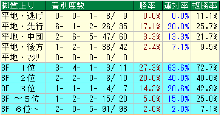 ・前走脚質追い込み(0・0・0・15)複勝率0%