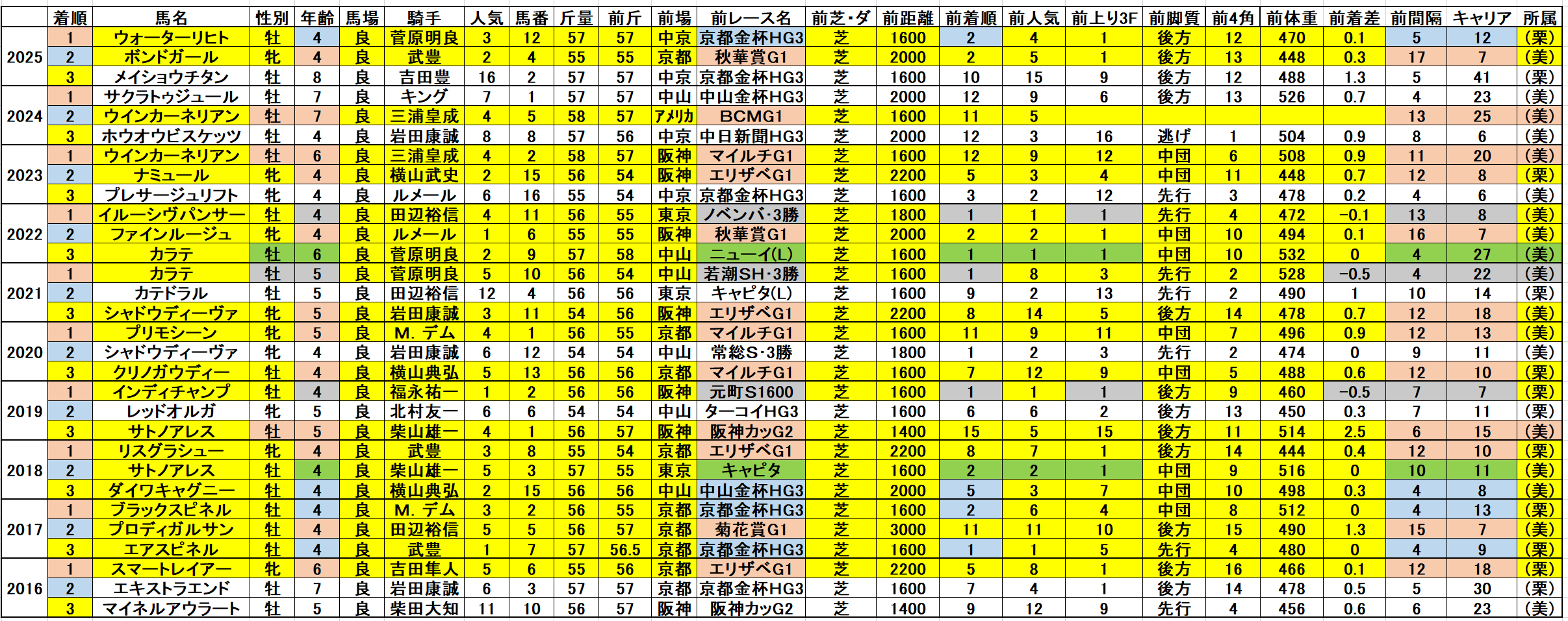 黄色部分は5番人気以内馬で、赤・青・緑・灰色部分は強調部分として色分けしています。