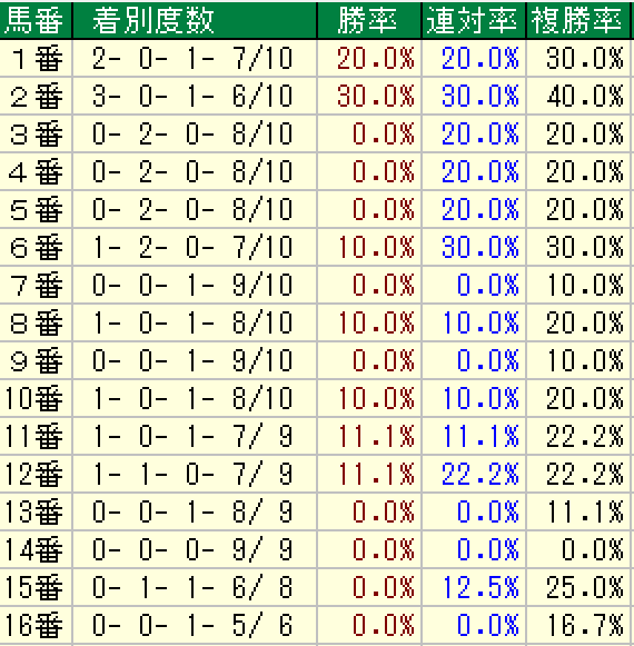 ひと昔前は完全に内枠有利なレースでしたが、これを見るとそれほど顕著ではない。