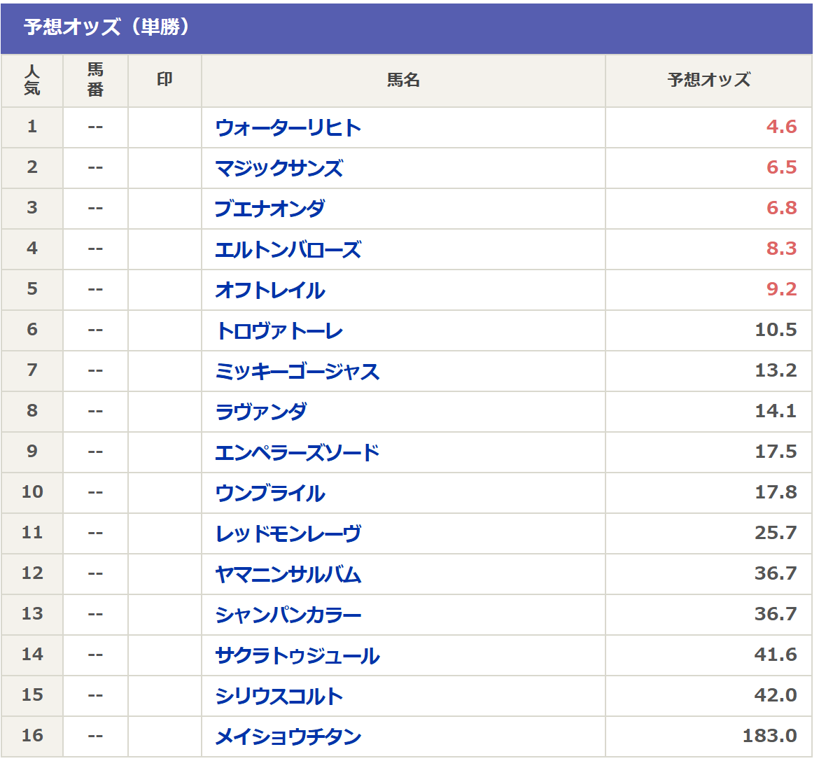 そして現在のnetkeibaさんの予想オッズは以下の通りです。