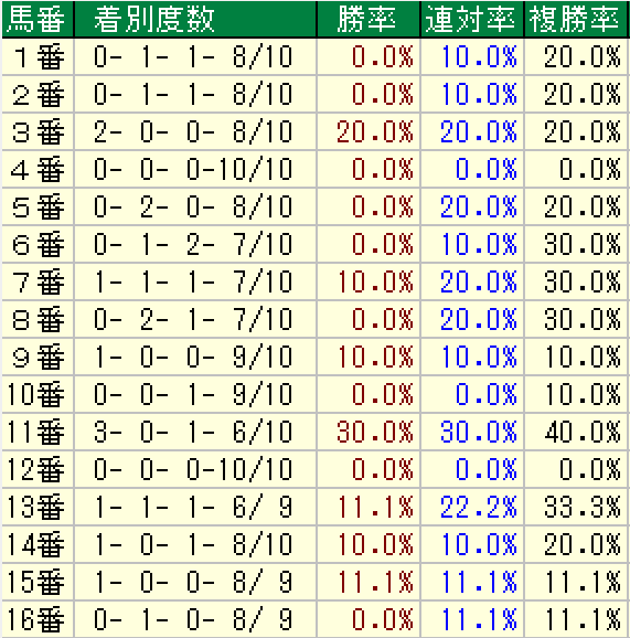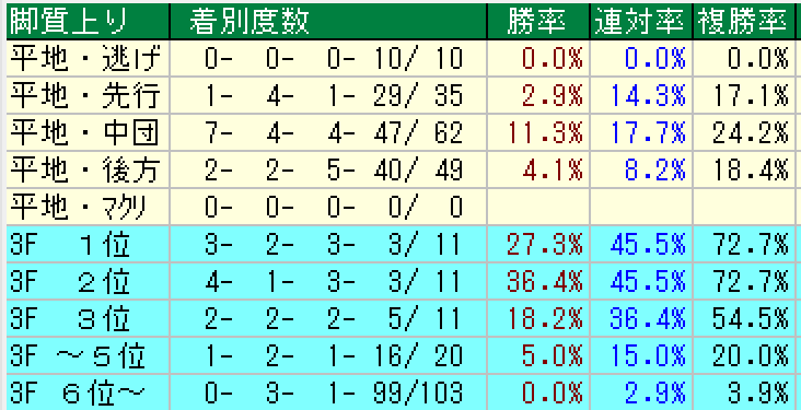当然ながら逃げ馬の好走無しで、先行馬は僅か1勝です。