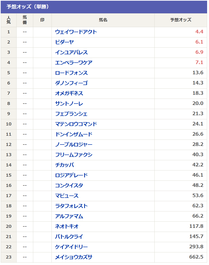 現時点の予想オッズを見ると4強構成となっているので、予想オッズ4番人気以内馬を上位人気馬として扱います。