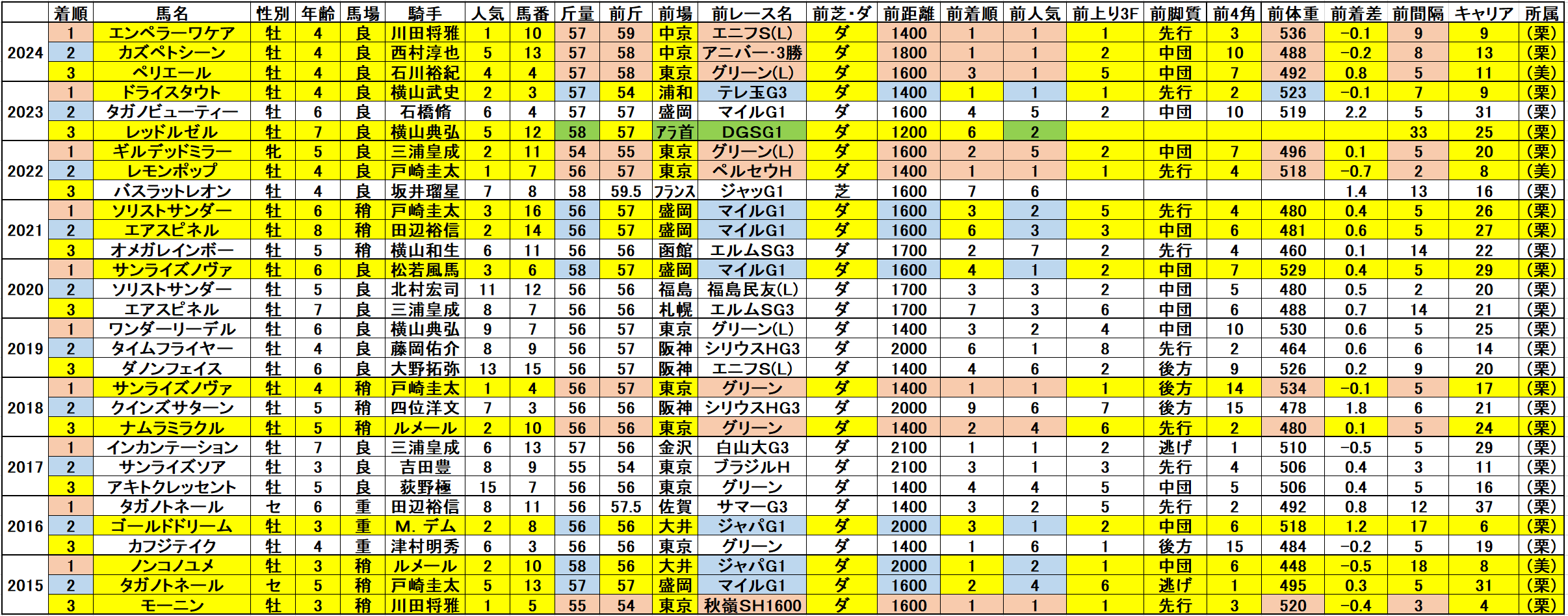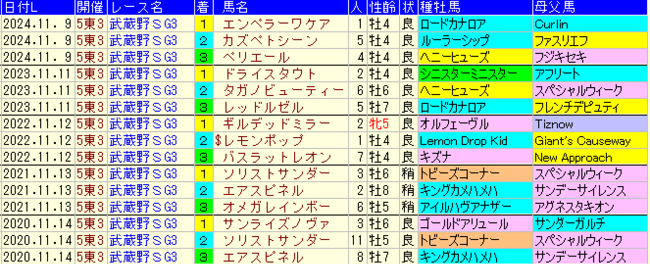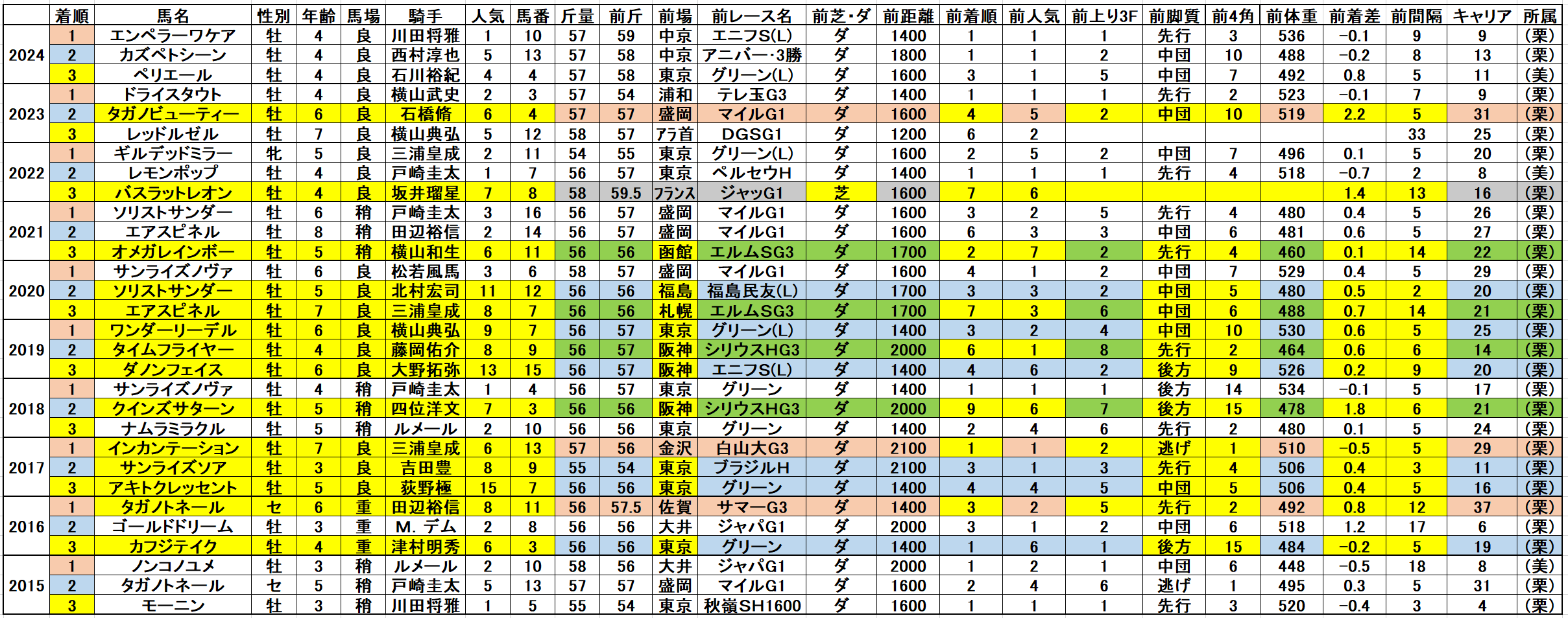 黄色部分は5番人気以内馬で、赤・青・緑色部分は強調部分として色分けしています。