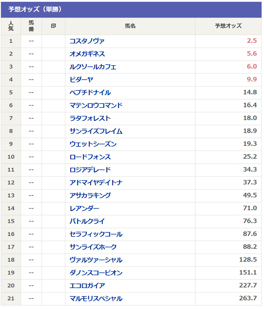 そして現在のnetkeibaさんの予想オッズは以下の通りです。