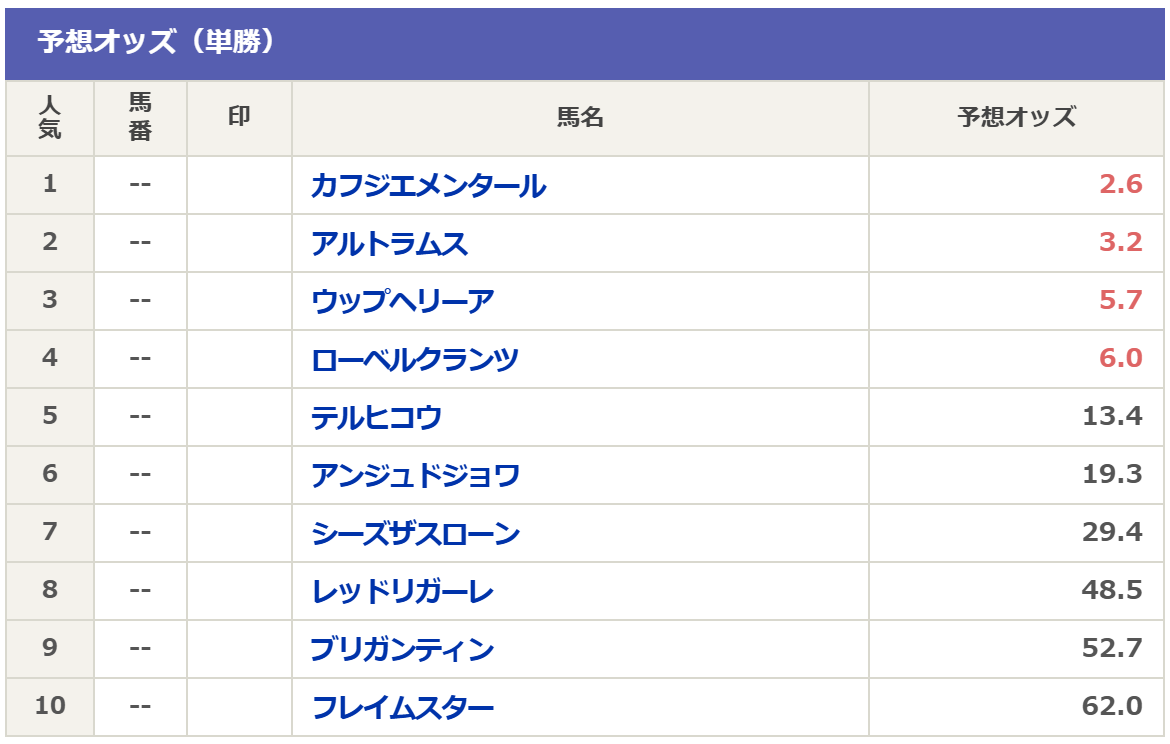 現時点の予想オッズを見ると4強構成となっているので、予想オッズ4番人気以内馬を上位人気馬として扱います。