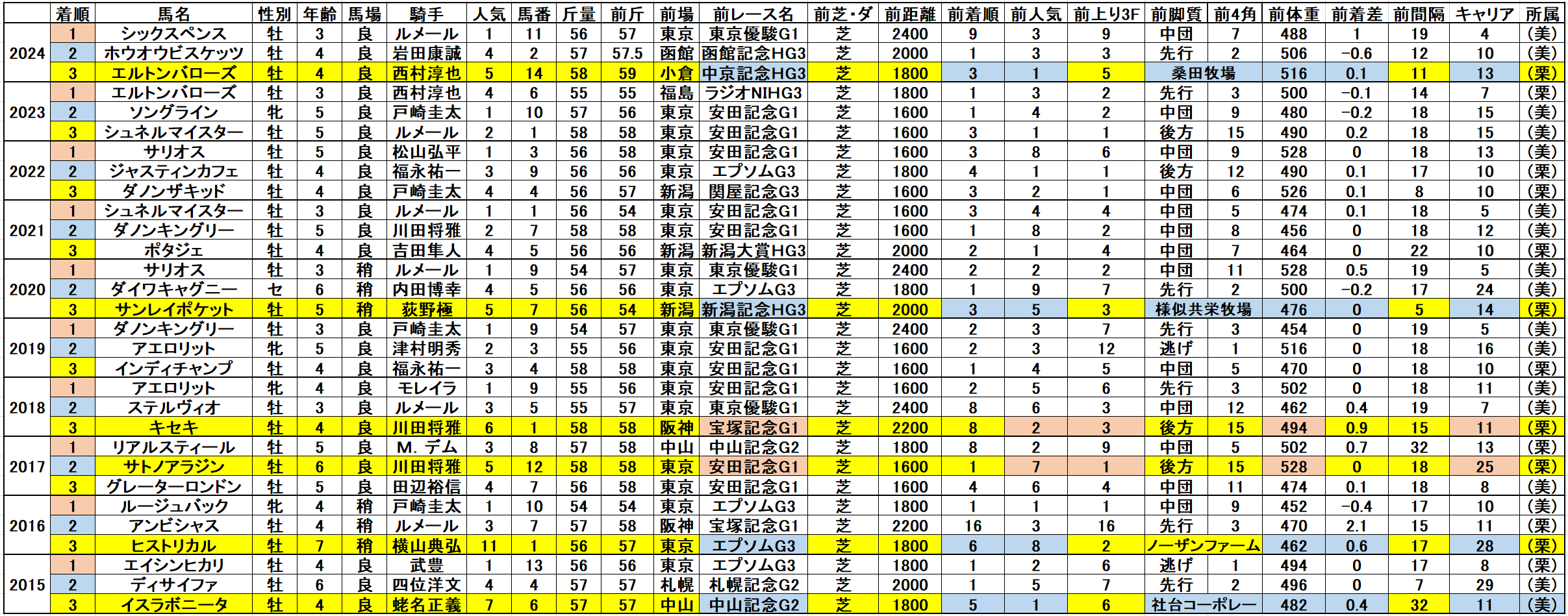 更に前走上りにも特徴があって過去に5番人気以下から好走した穴馬は6頭は全て前走重賞で上り6位以内という条件を満たしている。