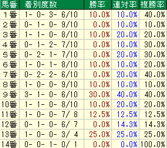 基本的に内が良さそうで外枠は不利と言えるでしょう。