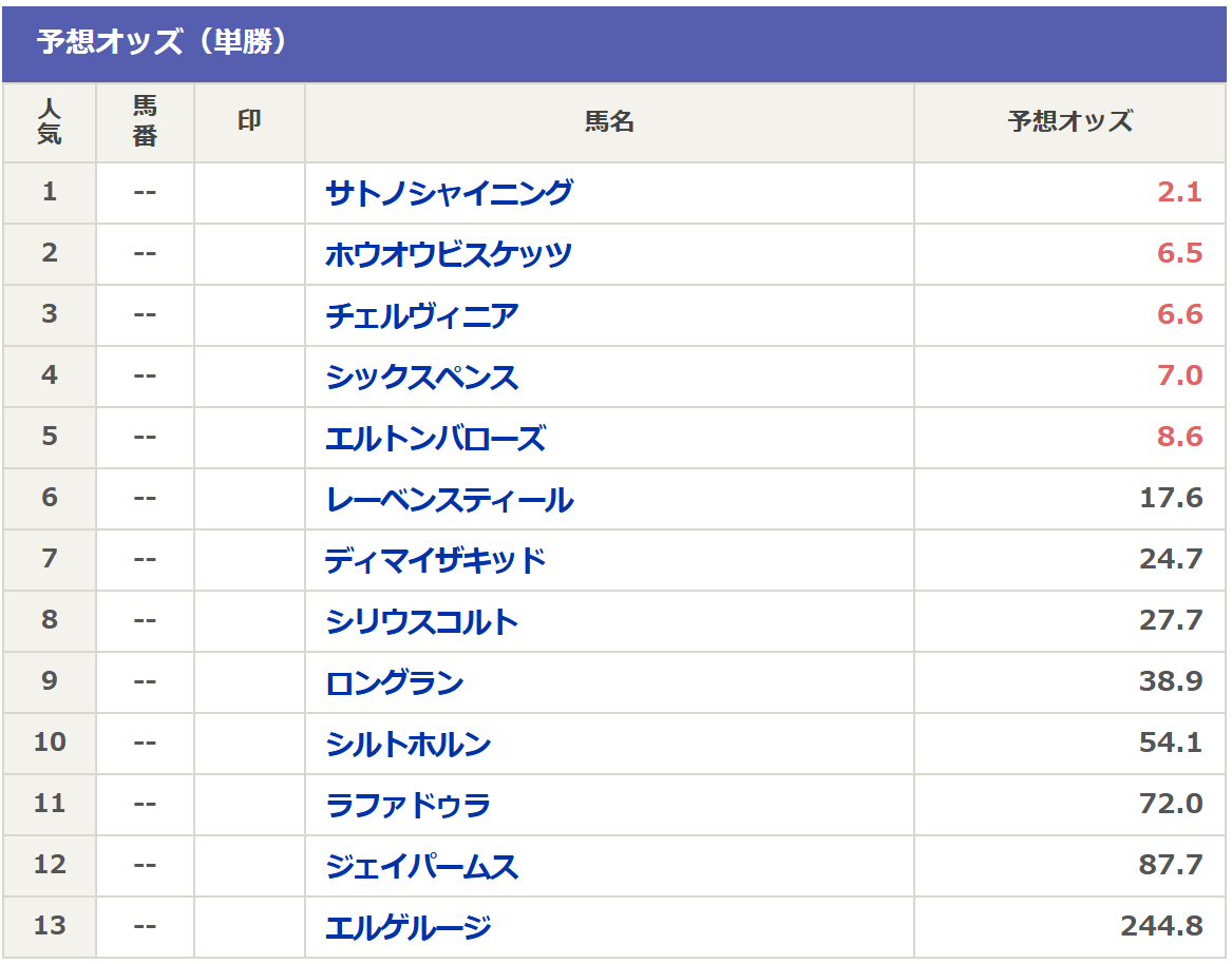現時点の予想オッズを見ると5強構成になっているので、予想オッズ5番人気以内馬を上位人気馬として扱います。