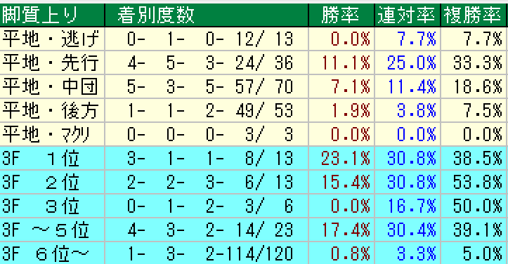 ・前走4角8番手以下(0・0・0・19)複勝率0%