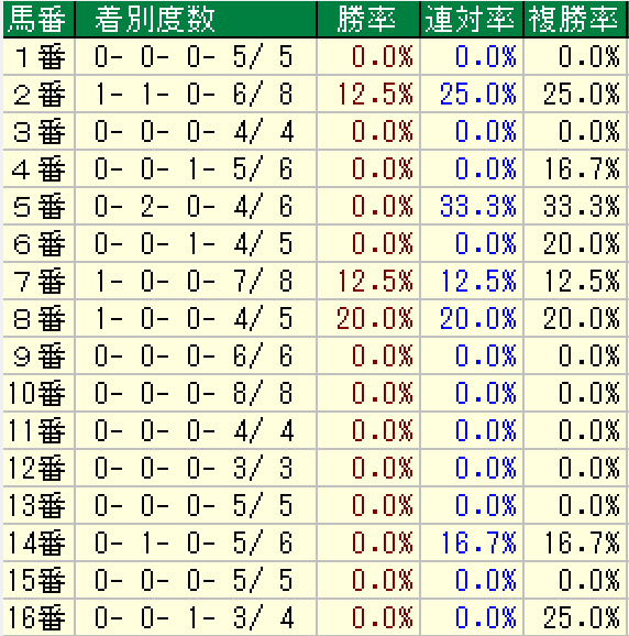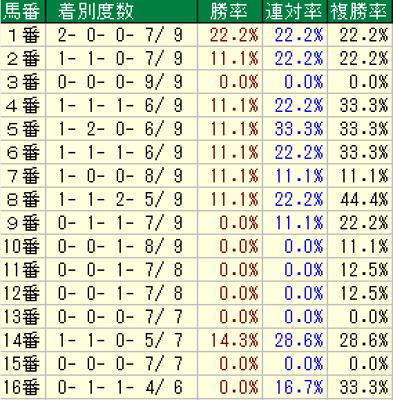 2016年以降の新潟開催を除く9年分の枠順傾向です。