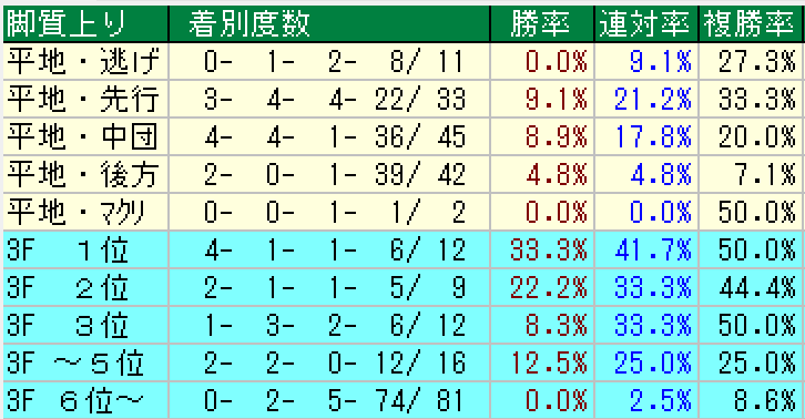 ・前走脚質逃げ(0・0・0・12)複勝率0%