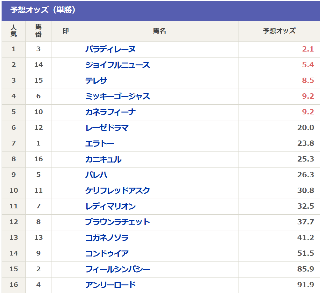 そして現在のnetkeibaさんの予想オッズは以下の通りです。