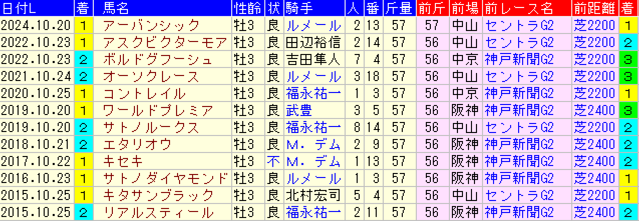 上記でセントライト記念組の2頭を挙げたが、ここでは神戸新聞杯3着以内馬を推す。