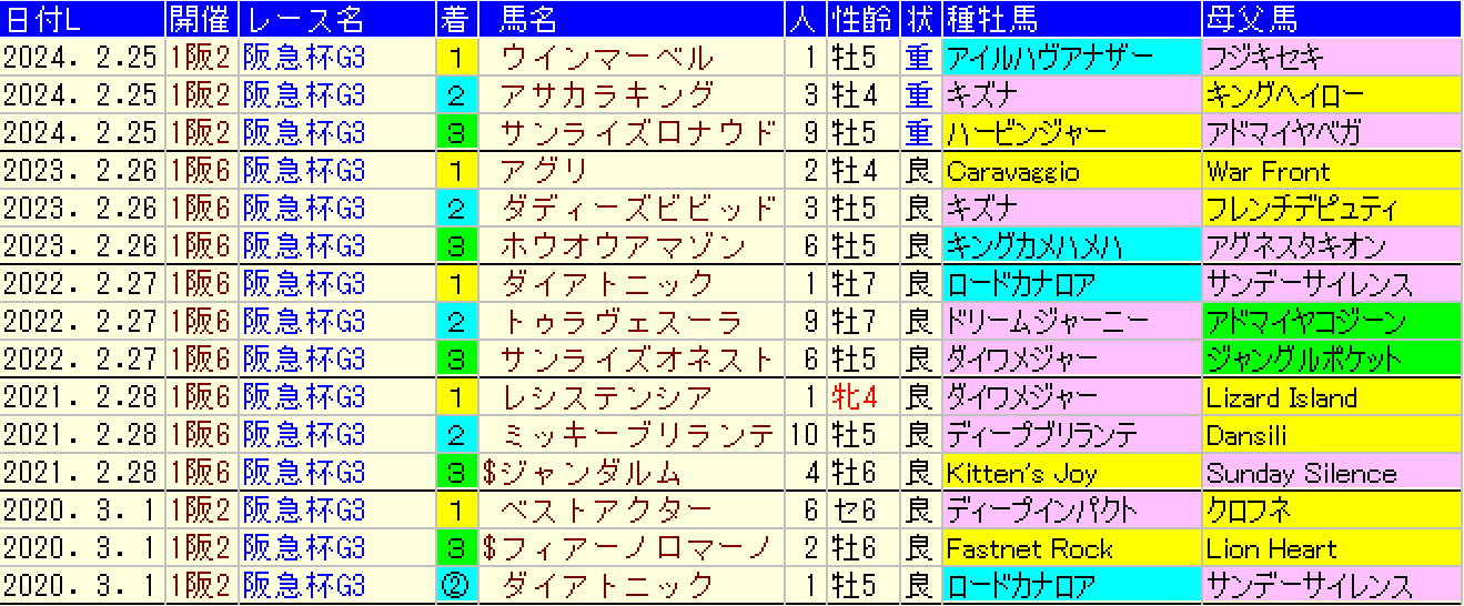 黄色部分は5番人気以内馬で、赤・青・緑・橙・灰色部分は強調部分として色分けしています。