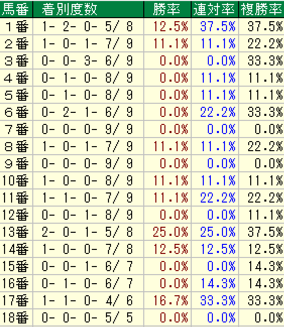これを見ると中枠~外枠にかけて勝ち馬が多い。