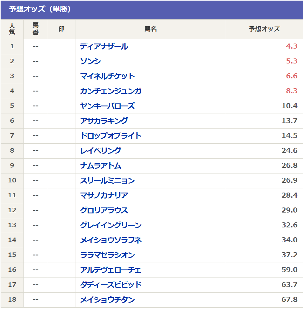 そして現在のnetkeibaさんの予想オッズは以下の通りです。
