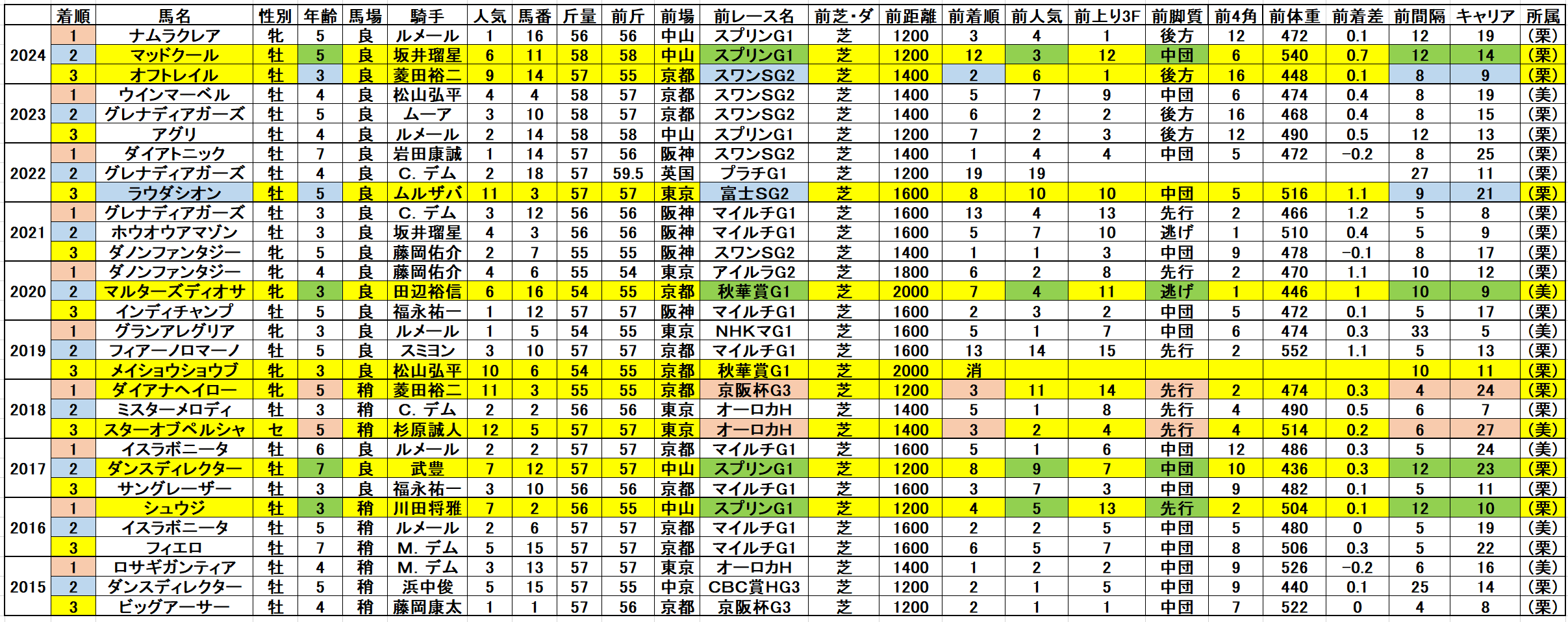 黄色部分は5番人気以内馬で、赤・青・緑色部分は強調部分として色分けしています。