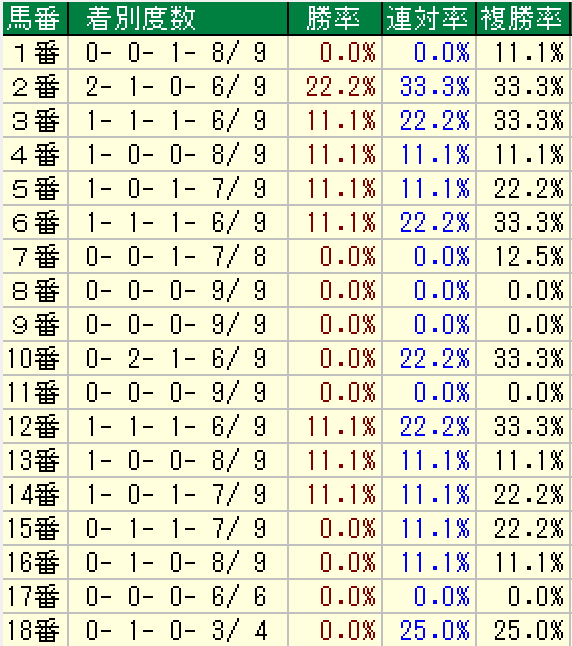 これを見ると6番ゲート以内が良さそうな気もするが外枠も悪くない。