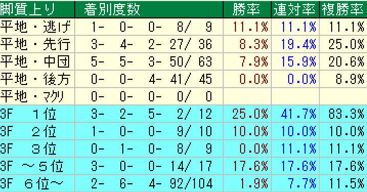 これを見ると決まり手はほほ先行・差しで特筆は上り1位の複勝率83,3%。