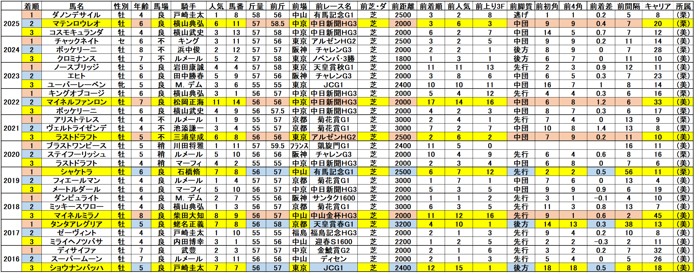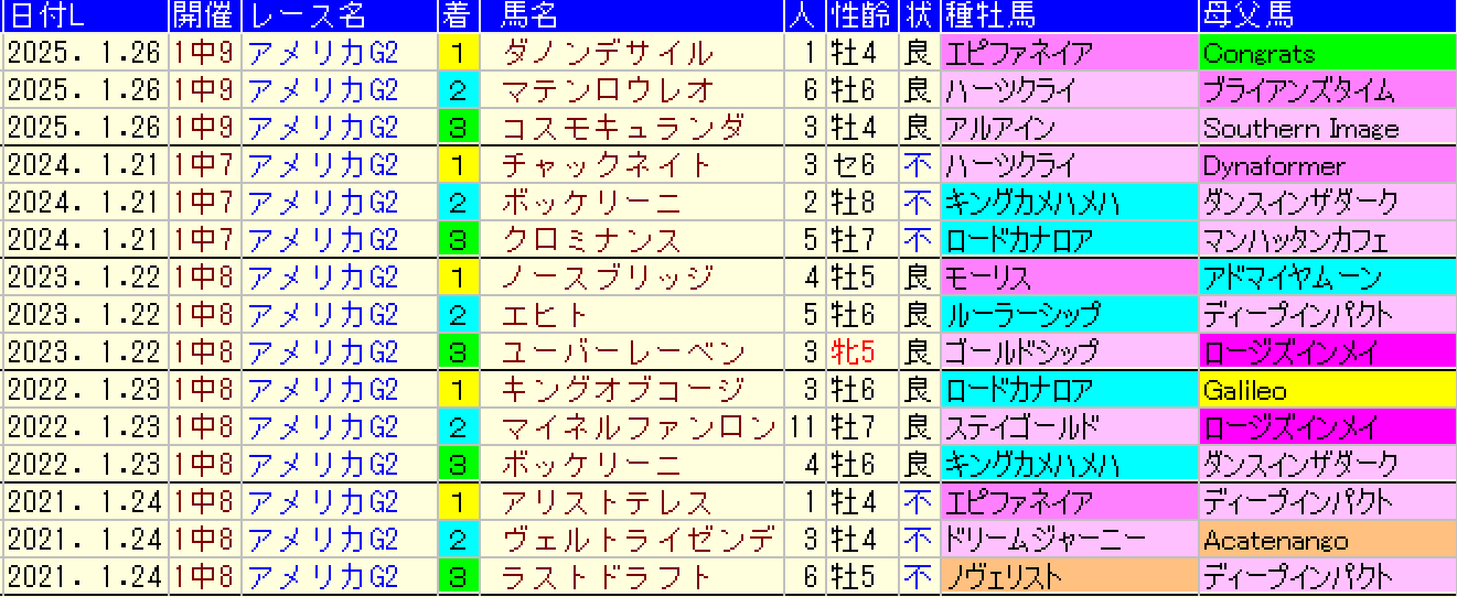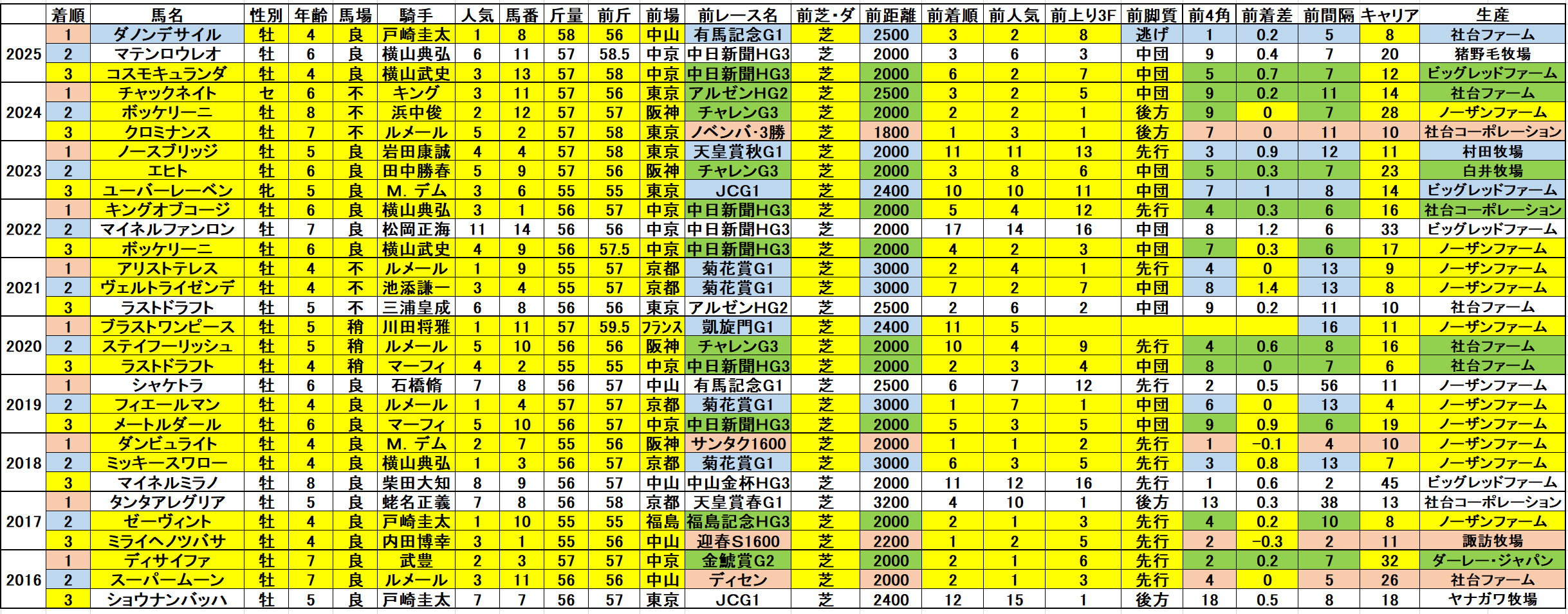 黄色部分は5番人気以内馬で、赤・青・緑色部分は強調部分として色分けしています。