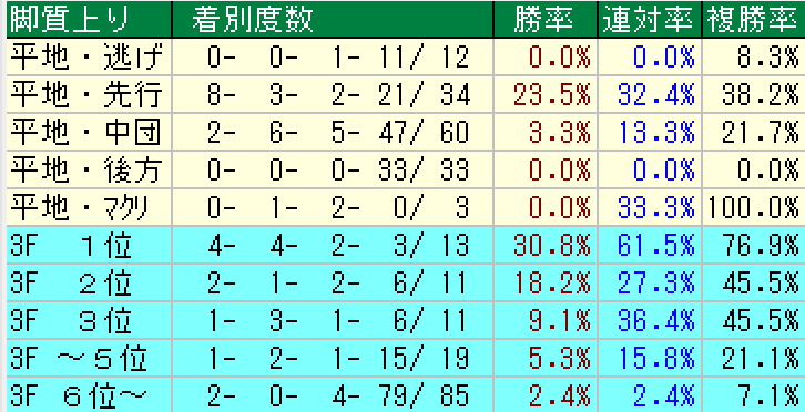 ・前走脚質逃げ(0・0・0・9)複勝率0%