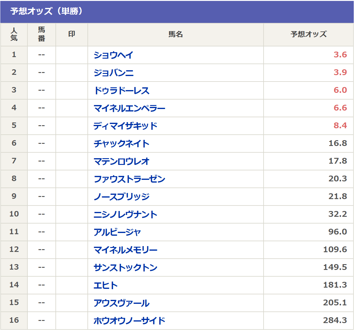 そして現在のnetkeibaさんの予想オッズは以下の通りです。